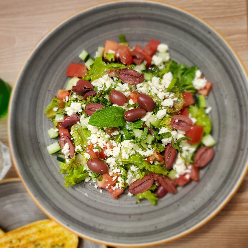 Mezcla de lechugas, queso feta, pepino cohombro, tomate, aceitunas Kalamata con vinagreta balsámica.