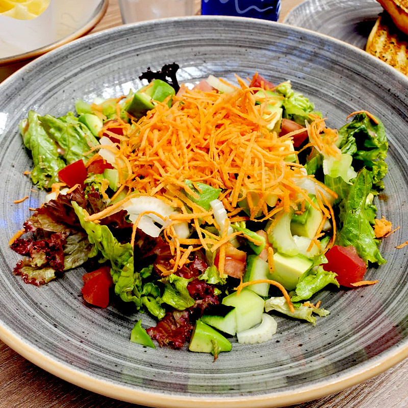 Mezcla de lechugas, tomate, aguacate, apio, pepino cohombro, zanahoria y vinagreta balsámica.