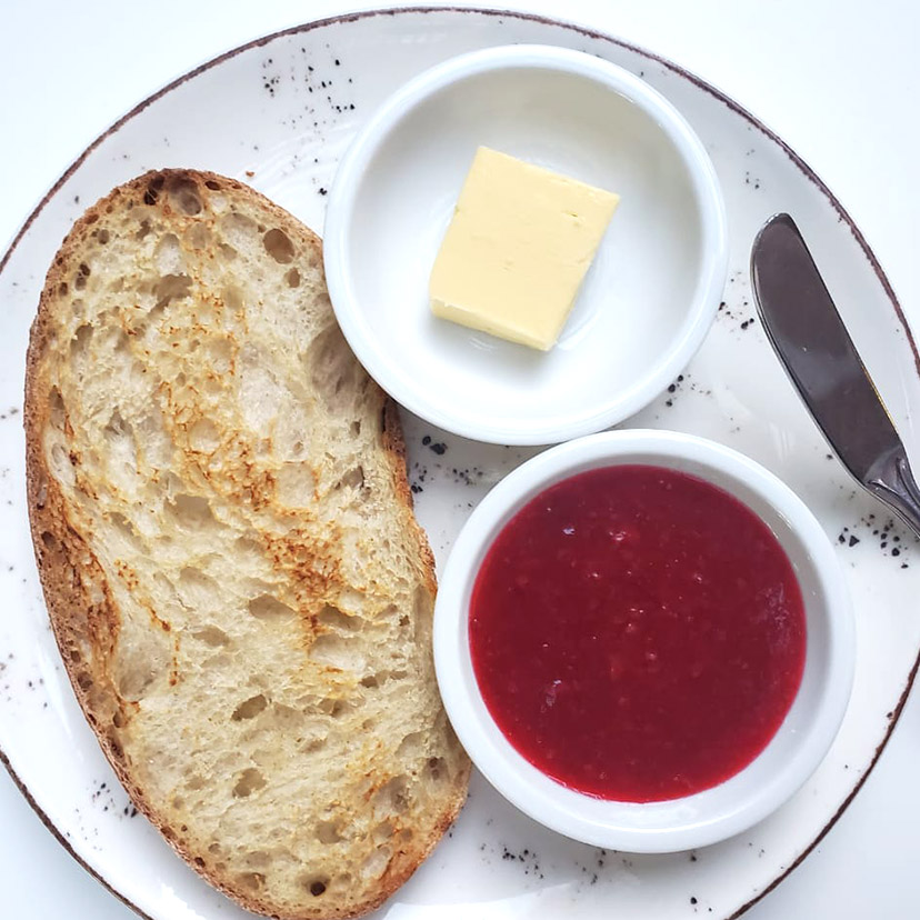 De pan integral o pan de corteza acompañada de mantequilla y mermelada